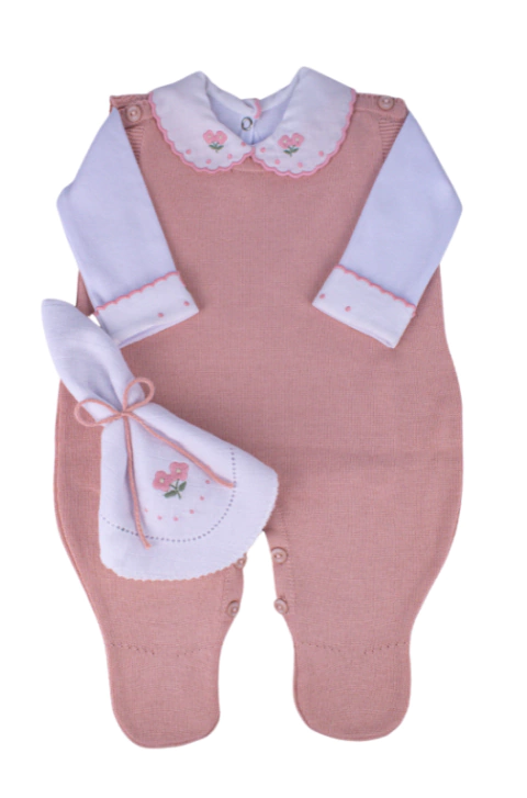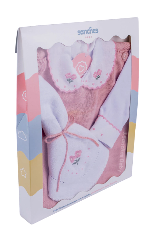 Ele é composto por 3 peças: 1 Body (97% algodão e 3% elastano) e Gola (100% algodão), 1 Macacão (100% acrílico) e 1 Pano de boca (100% algodão)